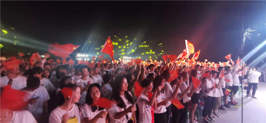 院關工委領導嚴肅主任也出席活動,并與5位演職人員上臺共同唱響《我和我的祖國》。在他們的帶動下,全場起立,800人共同揮舞手中的國旗,唱出心中對祖國的無限深情,歌聲響徹學院上空。