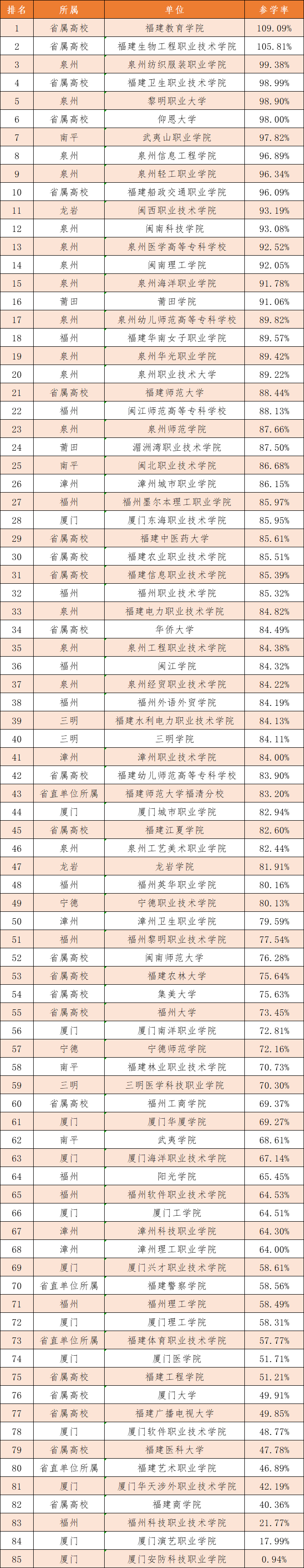 第九季第十三期“青年大學習”網(wǎng)上主題團課,高校團委中共有49所學校參學率達到80%,對以下各高校的團組織提出表揚:福建教育學院本周109.09%參學率獲得第一名,參學率最高。福建生物工程職業(yè)學院獲得第二名。排名第三至第五名分別泉州紡織服裝職業(yè)學院、福建衛(wèi)生職業(yè)技術(shù)學院、黎明職業(yè)大學,排名第六名至第十名為仰恩大學、武夷山職業(yè)學院、泉州信息工程學院、泉州輕工職業(yè)學院、福建船政交通職業(yè)學院。