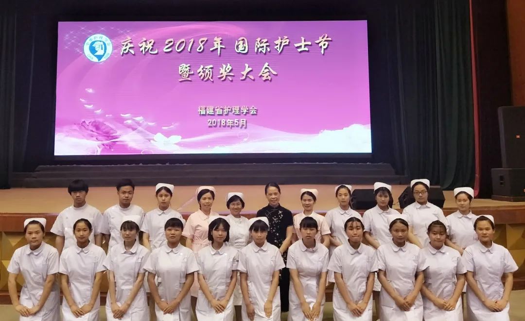 黃炎珍(第二排左三)和精準(zhǔn)扶貧班同學(xué)參加福建省國(guó)際護(hù)士節(jié)慶祝大會(huì)暨頒獎(jiǎng)典禮