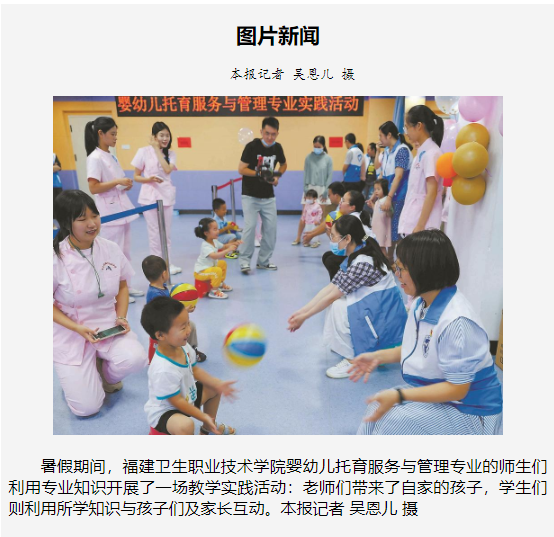 暑假期間,福建衛(wèi)生職業(yè)技術(shù)學院嬰幼兒托育服務與管理專業(yè)的師生們利用專業(yè)知識開展了一場教學實踐活動:老師們帶來了自家的孩子,學生們則利用所學知識與孩子們及家長互動。本報記者 吳恩兒 攝