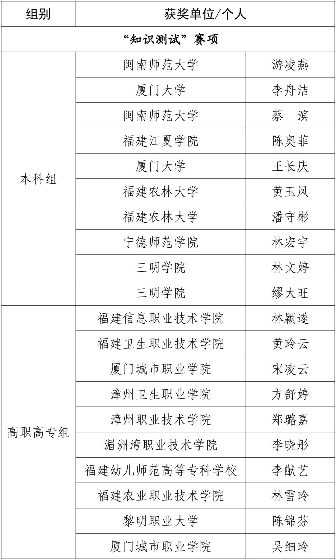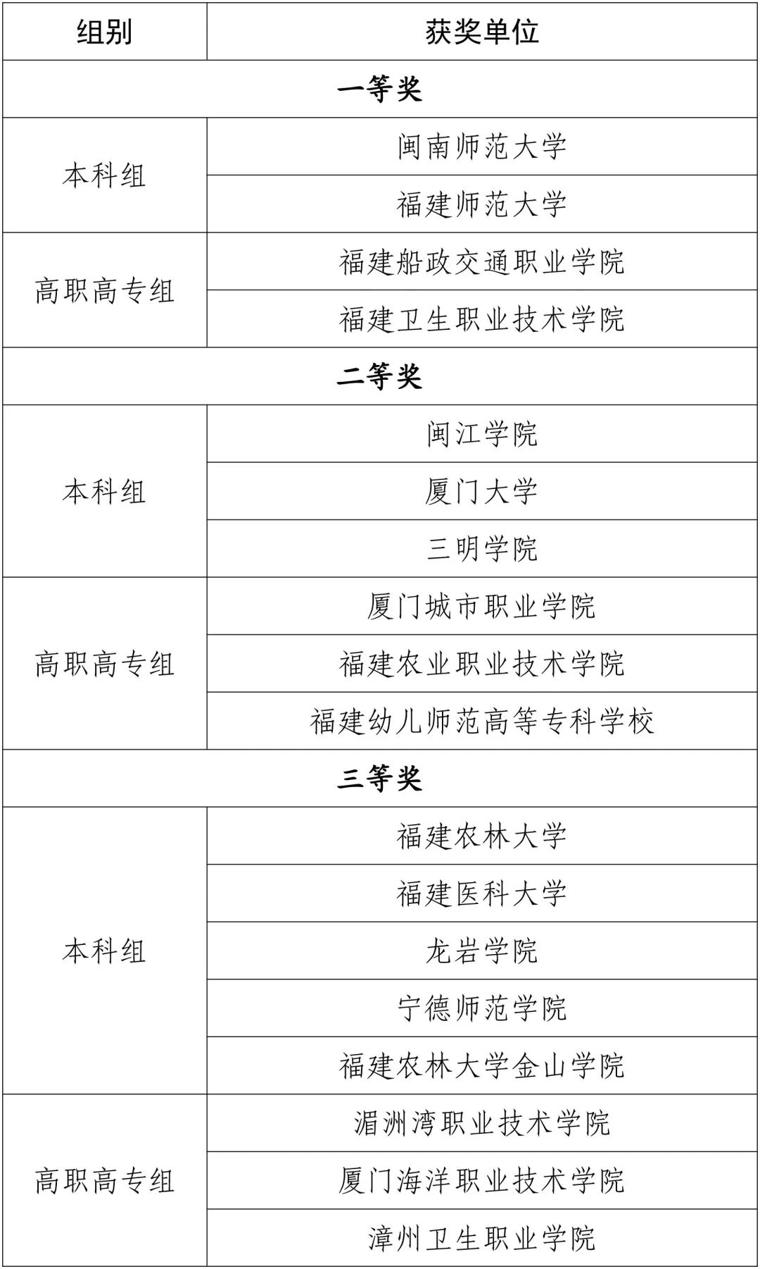 福建船政交通職業(yè)學(xué)院、福建衛(wèi)生職業(yè)技術(shù)學(xué)院獲高職高專組團體一等獎;閩江學(xué)院等3所學(xué)校獲本科組團體二等獎,廈門城市職業(yè)學(xué)院等3所學(xué)校獲高職高專組團體二等獎;福建農(nóng)林大學(xué)等5所學(xué)校獲本科組團體三等獎,湄洲灣職業(yè)技術(shù)學(xué)院等5所學(xué)校獲高職高專組團體三等獎。