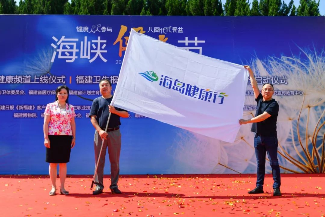 (莆田秀嶼區(qū)衛(wèi)健局副局長陳國富(中)接過福建省計(jì)劃生育協(xié)會(huì)項(xiàng)目工作部張晨霞部長(左一)與每周文摘報(bào)社總編輯、福建衛(wèi)生報(bào)總編輯陳冬青(右一)手中的旗幟,“海島健康行”公益品牌系列活動(dòng)正式啟動(dòng) )