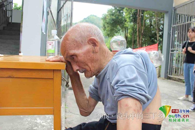 7月4日成員們在嶺腰村提供愛心醫(yī)療,老人因有脊椎病而行動不便,成員們?yōu)樗峁┝税喂?。中國青年網通訊員 吳雪兒 攝