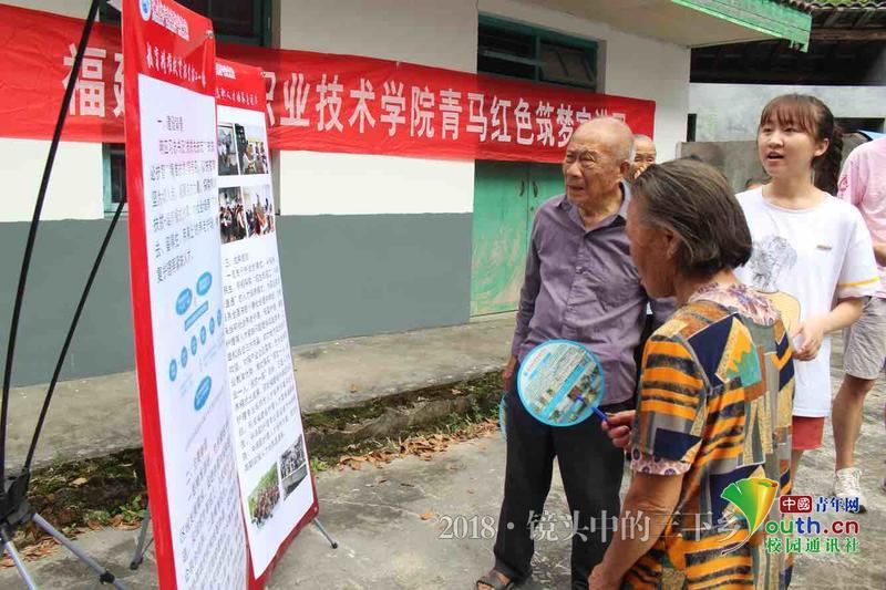 宣講團成員陳雨婷同學在旁解答村民們對展板上內容的疑問,村民們對扶貧政策有了各自的想法和見解。中國青年網通訊員 吳雪兒 攝