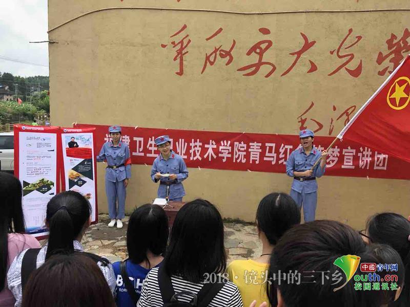 7月3日在水尾村禮堂前房鑫宣講習近平強軍思想,同學們穿上紅軍服,更深刻感受到了革命先輩的艱辛付出及當代強軍夢重要性。中國青年網通訊員 吳雪兒 攝