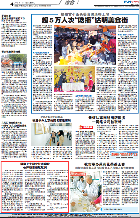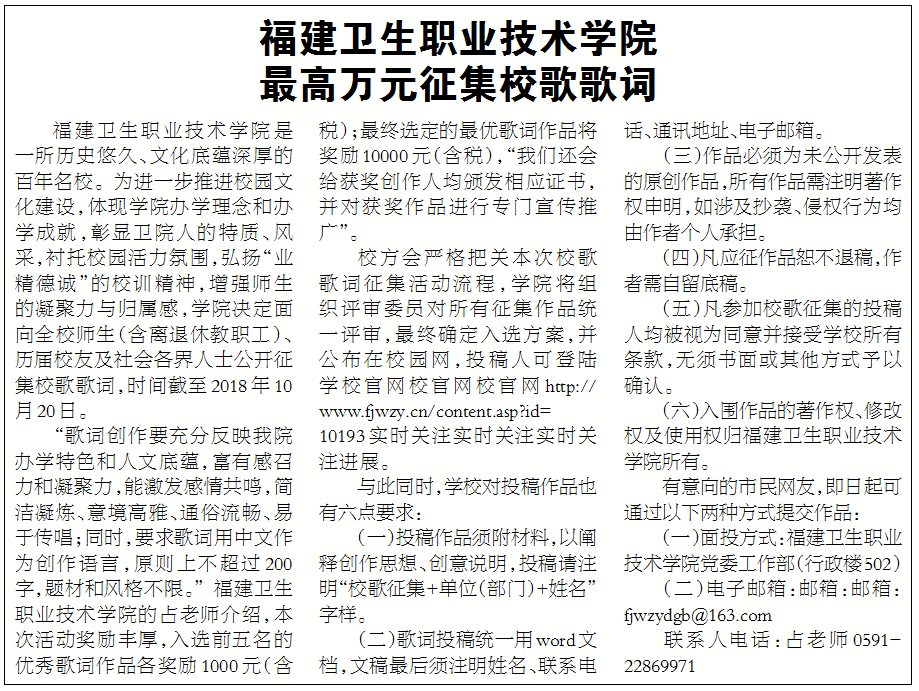 【福州日報】關(guān)于征集福建衛(wèi)生職業(yè)技術(shù)學院校歌歌詞的公告
