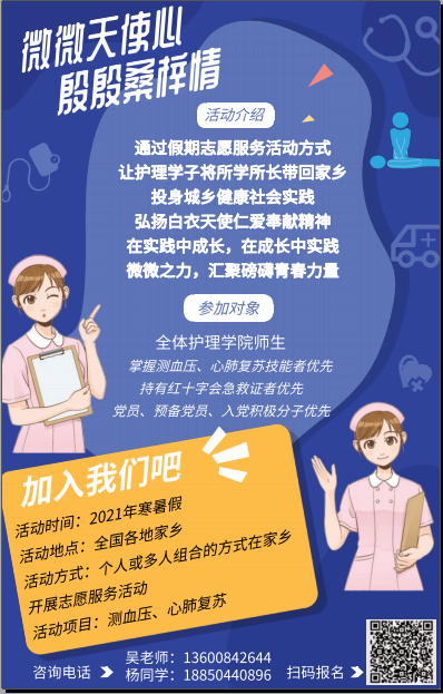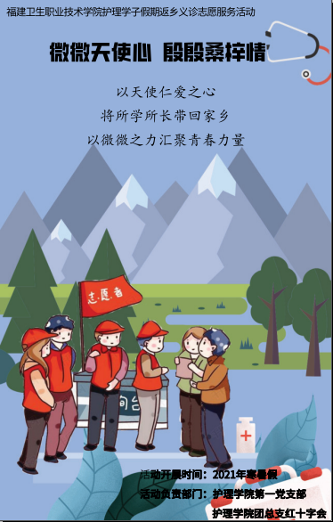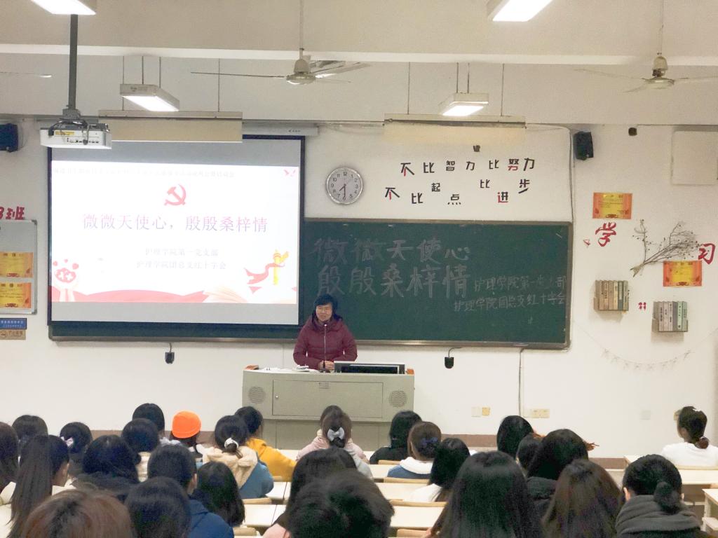 為充分發(fā)揮高?!半p帶頭人”教師黨支部在黨建、學(xué)術(shù)方面的獨(dú)特優(yōu)勢,做好黨支部帶頭引領(lǐng)作用與戰(zhàn)斗堡壘作用,同時增強(qiáng)共青團(tuán)帶領(lǐng)青年在經(jīng)濟(jì)社會發(fā)展中發(fā)揮生力軍和突擊隊(duì)作用,弘揚(yáng)紅十字會的人道、博愛、奉獻(xiàn)精神。我校護(hù)理學(xué)院第一黨支部協(xié)同護(hù)理學(xué)院團(tuán)總支紅十字會開展返鄉(xiāng)志愿服務(wù)活動,組織護(hù)理學(xué)子在2020年寒假返鄉(xiāng)期間,發(fā)揮護(hù)理專業(yè)的知識與技能,在家鄉(xiāng)開展志愿服務(wù)活動,反哺家鄉(xiāng)的養(yǎng)育之恩,弘揚(yáng)白衣天使的仁愛奉獻(xiàn)精神。