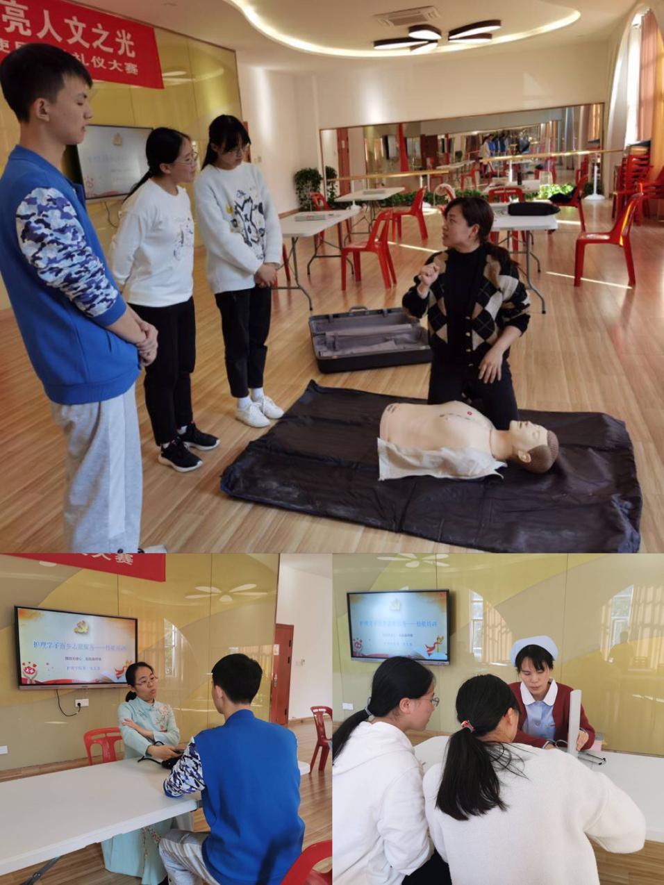志愿服務(wù)活動前培訓(xùn):護(hù)理實(shí)訓(xùn)室中,老師們正在細(xì)致的培訓(xùn)輔導(dǎo)。測血壓前后的各種注意要點(diǎn),心肺復(fù)蘇時的重點(diǎn)步驟,人文關(guān)懷要如何進(jìn)行……