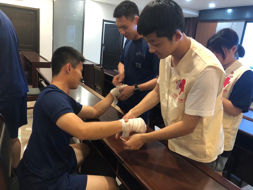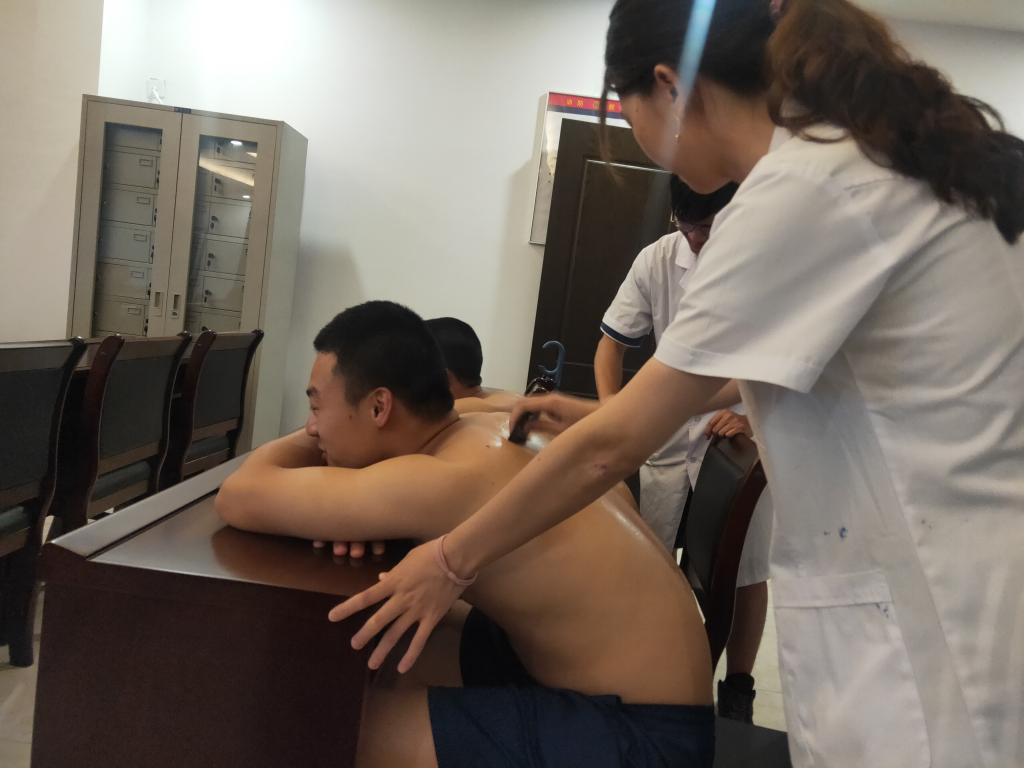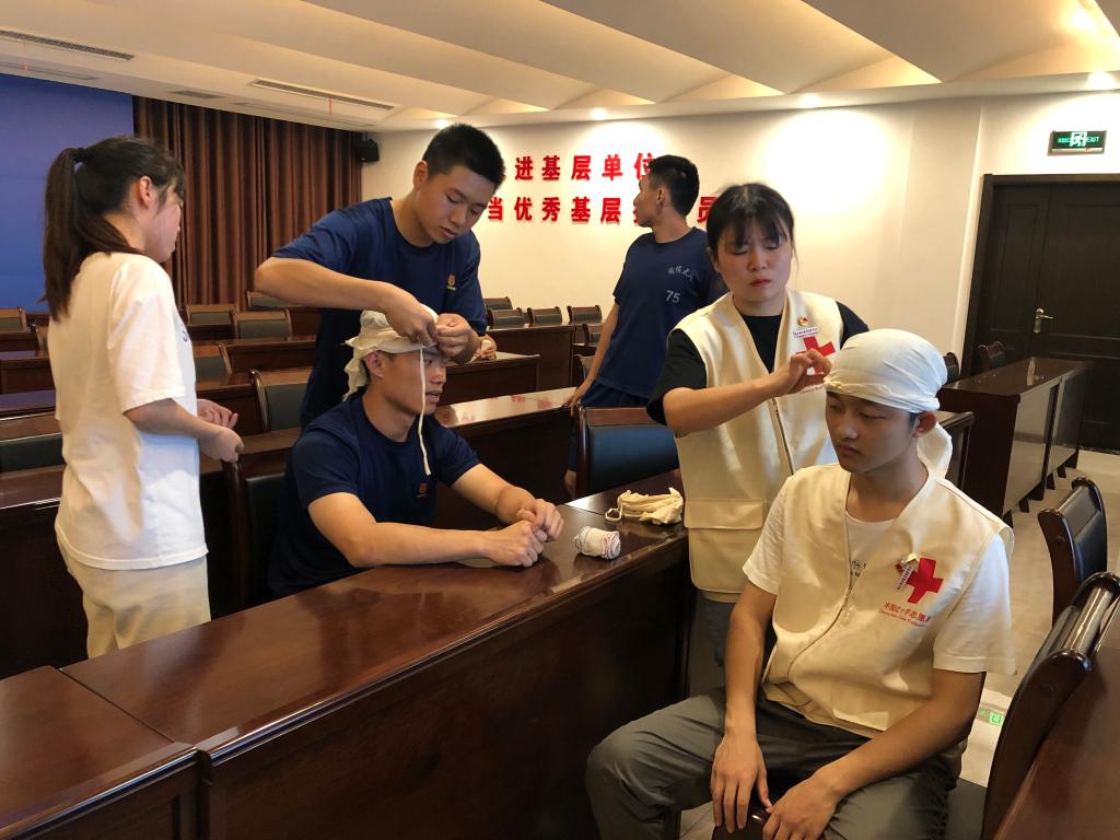 活動(dòng)開始,由醫(yī)學(xué)系紅十字會(huì)負(fù)責(zé)人王婷同學(xué)為消防員們?cè)敿?xì)講解繃帶三角巾包扎法的理論知識(shí),其余同學(xué)依次演示急救中常用的頭部、胸部、手部、膝蓋等部位的三角巾包扎手法。隨后,消防員們兩人一組在同學(xué)們的指導(dǎo)下進(jìn)行包扎實(shí)踐訓(xùn)練。最后,師生現(xiàn)場(chǎng)為消防員們提供刮痧拔罐義診活動(dòng)。