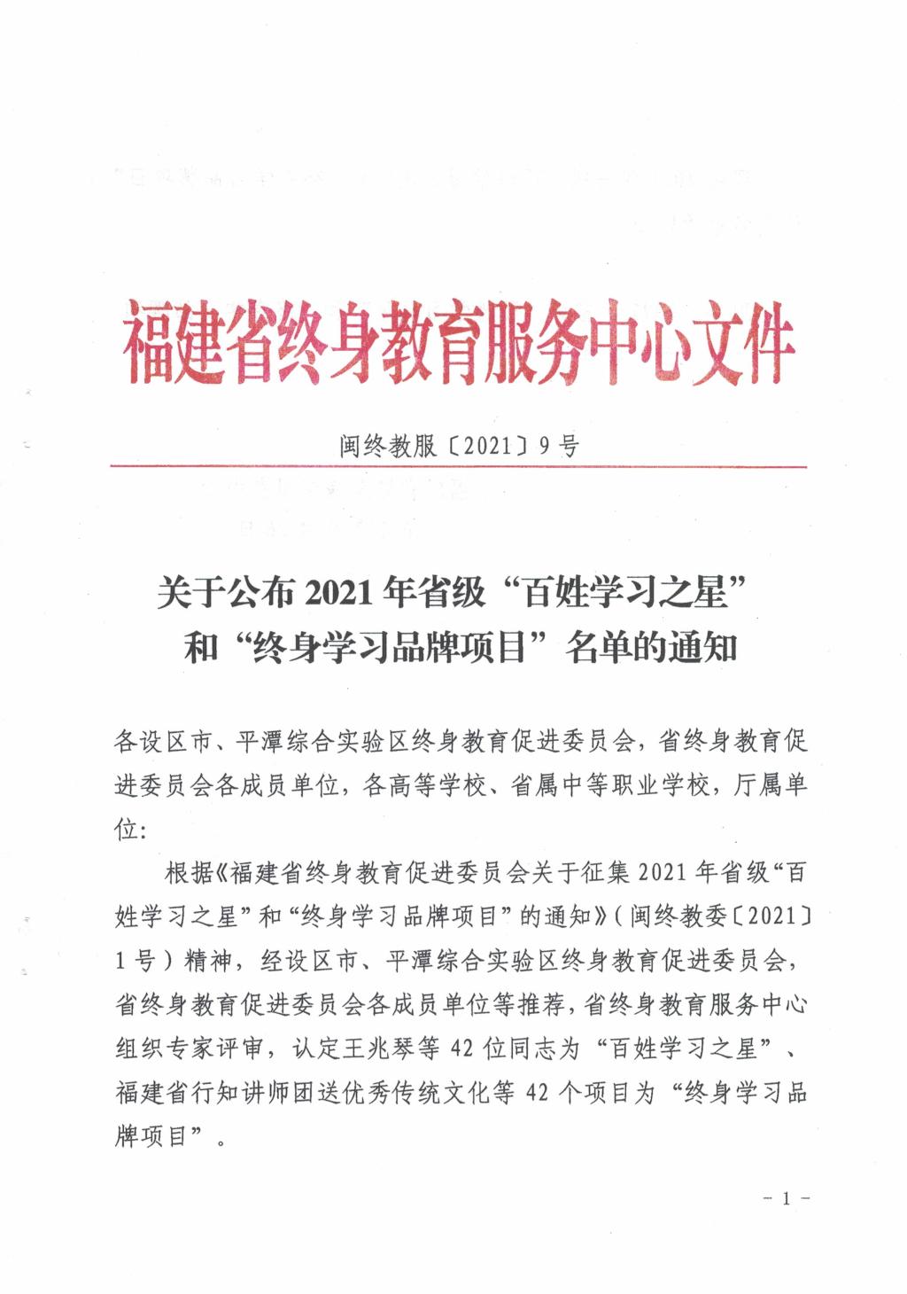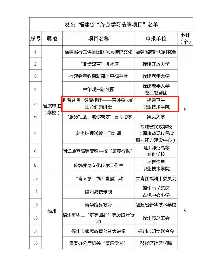 近日,根據(jù)文件《關(guān)于公布2021年省級(jí)“百姓學(xué)習(xí)之星” 和“終身學(xué)習(xí)品牌項(xiàng)目”名單的通知》閩終教服〔2021〕9號(hào),我校健康管理系揭金花老師認(rèn)定為2021年省級(jí)“百姓學(xué)習(xí)之星”;醫(yī)學(xué)基礎(chǔ)部項(xiàng)目“科普益民,健康相伴——百姓身邊的生命健康講堂”認(rèn)定為2021年省級(jí)“終身學(xué)習(xí)品牌項(xiàng)目”。特此祝賀!