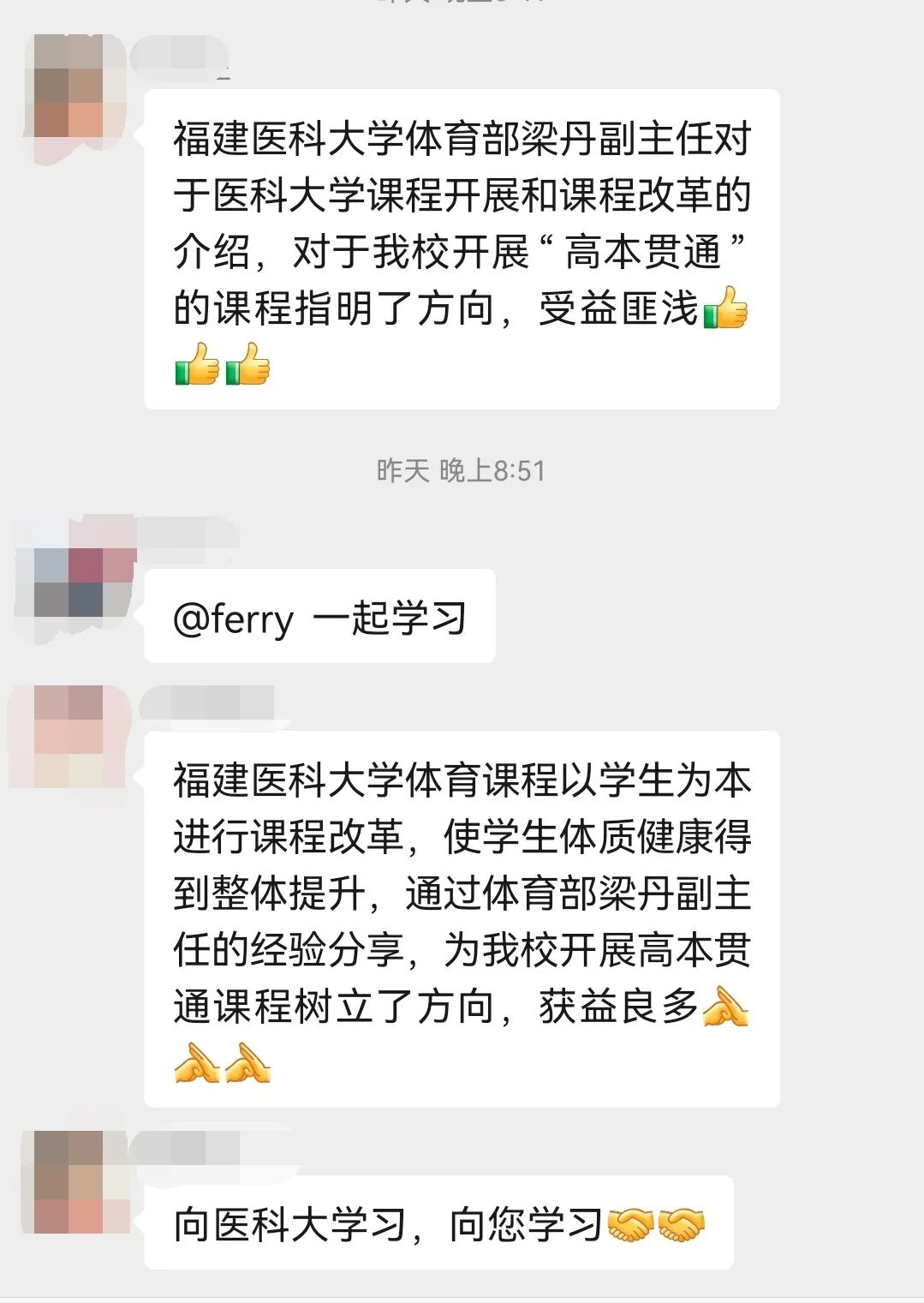 梁丹還圍繞教學(xué)目標(biāo)、教學(xué)內(nèi)容以及教學(xué)評(píng)價(jià)等方面,就“高本貫通”體育課程教學(xué)以及如何與福建醫(yī)科大學(xué)體育課程深度融合,在會(huì)上與我校體育部教師進(jìn)行深入地探討,為后期的教學(xué)指明了方向。