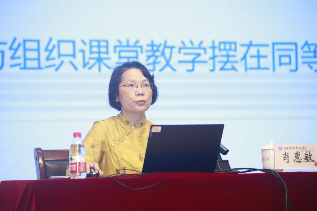 肖惠敏教授重點(diǎn)圍繞社會(huì)實(shí)踐課程內(nèi)涵式高質(zhì)量發(fā)展以及社會(huì)性實(shí)踐教學(xué)模式兩個(gè)方面,為教師們解讀服務(wù)性學(xué)習(xí)的概念以及服務(wù)性學(xué)習(xí)必須具備的五個(gè)內(nèi)涵特征,細(xì)致講解服務(wù)性學(xué)習(xí)的具體實(shí)施步驟。她還以福建醫(yī)科大學(xué)《老年護(hù)理學(xué)》課程的社會(huì)實(shí)踐活動(dòng)為例,分享了社會(huì)實(shí)踐課程建設(shè)的基本思路和過程。