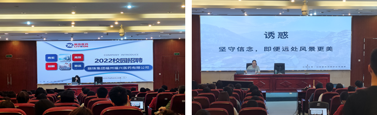 會上,企業(yè)負責人向同學們介紹了公司概況、崗位職責、薪資待遇和發(fā)展規(guī)劃,闡述了公司的運營模式、運營范圍及人才需求,傳達了企業(yè)的文化價值觀、人力資源政策、招聘程序和職位等信息,并現場回答同學們的問題,讓學生對企業(yè)有更立體、直觀的了解。企業(yè)負責人鼓勵畢業(yè)生入職后,從基層崗位做起,利用自身在學校所學的專業(yè)知識,投入到服務廣大人民身心健康的醫(yī)藥衛(wèi)生事業(yè)中,實現個人發(fā)展進步的同時,也為企業(yè)創(chuàng)造價值,為健康中國、健康福建貢獻青春磅礴力量。