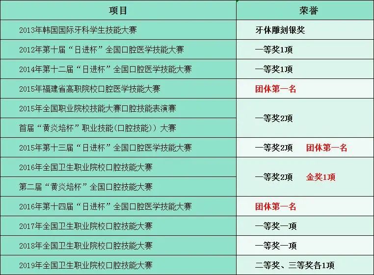 近年來,學(xué)生在各級(jí)別口腔醫(yī)學(xué)技能大賽上共獲37個(gè)獎(jiǎng)項(xiàng),包括國際銀獎(jiǎng)1項(xiàng)、全國金獎(jiǎng)1項(xiàng)、全國一等獎(jiǎng)10項(xiàng)、2次全國團(tuán)體第一名、1次省級(jí)團(tuán)體第一名。學(xué)生獲第五屆國際口腔技師學(xué)術(shù)大會(huì)(韓國)口腔醫(yī)學(xué)技術(shù)專業(yè)石膏牙雕刻銀獎(jiǎng)(第二名),是第一個(gè)在該項(xiàng)國際比賽中獲獎(jiǎng)的中國學(xué)生,實(shí)現(xiàn)了中國零的突破。