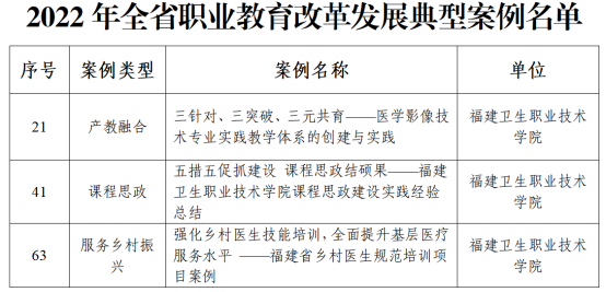近日,福建省職業(yè)技術(shù)教育中心公布2022年全省職業(yè)教育改革發(fā)展典型案例名單。我校報(bào)送的《三針對(duì)、三突破、三元共育——醫(yī)學(xué)影像技術(shù)專業(yè)實(shí)踐教學(xué)體系的創(chuàng)建與實(shí)踐》(醫(yī)學(xué)技術(shù)系)、《五措五促抓建設(shè)課程思政結(jié)碩果——福建衛(wèi)生職業(yè)技術(shù)學(xué)院課程思政建設(shè)實(shí)踐經(jīng)驗(yàn)總結(jié)》(藥學(xué)院)、《強(qiáng)化鄉(xiāng)村醫(yī)生技能培訓(xùn),全面提升基層醫(yī)療服務(wù)水平——福建省鄉(xiāng)村醫(yī)生規(guī)范培訓(xùn)項(xiàng)目案例》(繼續(xù)教育學(xué)院)三個(gè)案例分別入選“產(chǎn)教融合”“課程思政”“服務(wù)鄉(xiāng)村振興”類型典型案例。