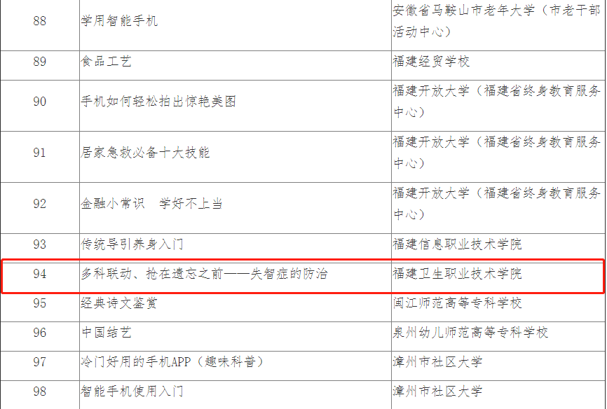 近日,教育部職業(yè)教育與成人教育司公示智慧助老優(yōu)質(zhì)工作案例、教育培訓(xùn)項(xiàng)目及課程資源第二批推介名單,我校醫(yī)學(xué)院林玉瓊老師負(fù)責(zé)的《多科聯(lián)動(dòng)、搶在遺忘之前——失智癥的防治》入選優(yōu)質(zhì)課程資源。