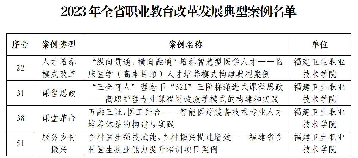 近日,福建省職業(yè)技術(shù)教育中心公布2023年全省職業(yè)教育改革發(fā)展典型案例名單,我校報(bào)送的《“縱向貫通、橫向融通”培養(yǎng)智慧型醫(yī)學(xué)人才——臨床醫(yī)學(xué)(高本貫通)人才培養(yǎng)模式構(gòu)建典型案例》(醫(yī)學(xué)院)、《“三全育人”理念下“321”三階梯遞進(jìn)式課程思政——高職護(hù)理專業(yè)課程思政教學(xué)模式的構(gòu)建和實(shí)踐》(護(hù)理學(xué)院)、《五融三證、醫(yī)工結(jié)合——智能醫(yī)療裝備技術(shù)專業(yè)人才培養(yǎng)體系的構(gòu)建與實(shí)踐》(醫(yī)學(xué)技術(shù)系)、《鄉(xiāng)村醫(yī)生強(qiáng)技賦能,鄉(xiāng)村振興提速增效——福建省鄉(xiāng)村醫(yī)生執(zhí)業(yè)能力提升培訓(xùn)項(xiàng)目案例》(繼續(xù)教育學(xué)院)四個(gè)案例分別入選“人才培養(yǎng)模式改革”“課程思政”“課堂革命”“服務(wù)鄉(xiāng)村振興”類型典型案例。