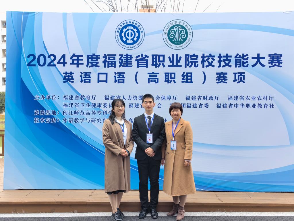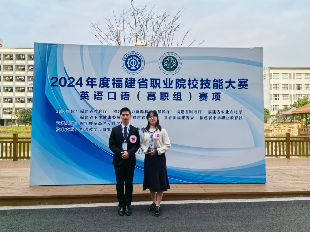 12月29日至31日,2024年福建省職業(yè)院校技能大賽高職組“英語(yǔ)口語(yǔ)”賽項(xiàng)在閩江師范高等專(zhuān)科學(xué)校舉行。此次競(jìng)賽分為英語(yǔ)專(zhuān)業(yè)組和非專(zhuān)業(yè)組,賽制由以往的“學(xué)生個(gè)人賽”轉(zhuǎn)變?yōu)椤皫熒悺?。其中非?zhuān)業(yè)組共有來(lái)自全省40多所高職院校的師生隊(duì)伍參加。我校2022級(jí)護(hù)理315班黃道凱同學(xué)和人文教學(xué)部外語(yǔ)教研室盧叢珊老師經(jīng)過(guò)兩個(gè)多月的賽前培訓(xùn),在比賽中團(tuán)結(jié)協(xié)作,榮獲非專(zhuān)業(yè)組二等獎(jiǎng)。