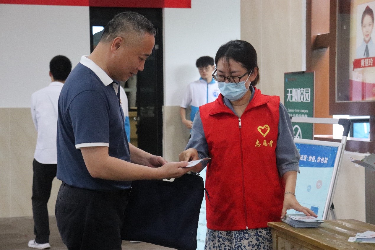 啟動儀式上,閩侯縣疾控中心、荊溪鎮(zhèn)衛(wèi)生院,以及學(xué)校后勤管理處、學(xué)生工作部、團(tuán)委的無煙志愿者們現(xiàn)場為參會師生發(fā)放控?zé)熜麄鞑牧?,普及煙草危害知識。