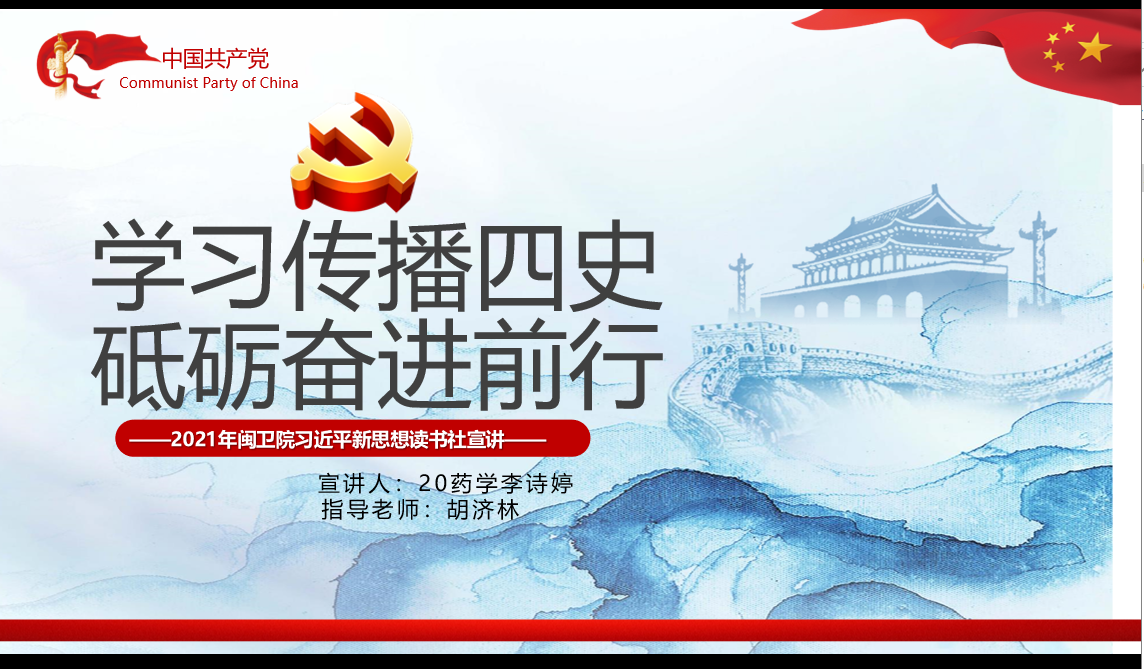2021年5月10日下午,習(xí)近平新時代中國特色社會主義思想讀書社宣講團(tuán)在胡濟(jì)林老師指導(dǎo)下,前往20級藥學(xué)305-307班開展宣講活動,此次宣講人是李詩婷,她宣講的主題是“學(xué)習(xí)傳播‘四史’ 砥礪奮進(jìn)前行”。
