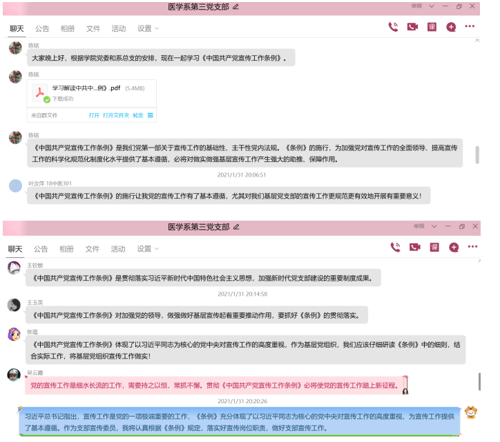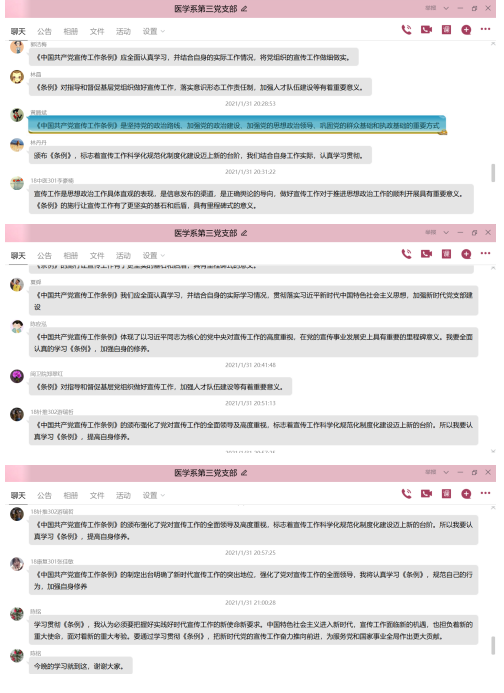 為深入學(xué)習(xí)貫徹《中國(guó)共產(chǎn)黨宣傳工作條例》(以下簡(jiǎn)稱《條例》),1月31日晚,醫(yī)學(xué)系第三黨支部于線上組織開展《條例》學(xué)習(xí)活動(dòng)。此次活動(dòng)由支部書記陳銘同志主持,支部全體黨員及預(yù)備黨員均參加。