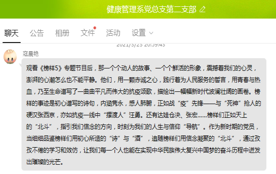 為宣傳偉大抗疫精神,集中展現(xiàn)新冠肺炎疫情防控阻擊戰(zhàn)中先進(jìn)基層黨組織和優(yōu)秀共產(chǎn)黨員風(fēng)采,深化拓展“不忘初心、牢記使命”主題教育成果,擴(kuò)大全國優(yōu)秀共產(chǎn)黨員和先進(jìn)基層黨組織評(píng)選表彰成效,營造團(tuán)結(jié)鼓勁、弘揚(yáng)正氣的濃厚氛圍,3月23日,健康管理系黨總支第二支部組織全體師生黨員在線收看《榜樣5》。