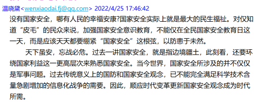 教師黨員溫曉黛同志表示,沒有國(guó)家安全,哪有人民的幸福安康?國(guó)家安全實(shí)際上就是最大的民生福祉。對(duì)僅知道“皮毛”的民眾來說,加強(qiáng)國(guó)家安全意識(shí)教育,不能僅在全民國(guó)家安全教育日這一天,而是應(yīng)該天天都要繃緊“國(guó)家安全”這根弦,以防患于未然。