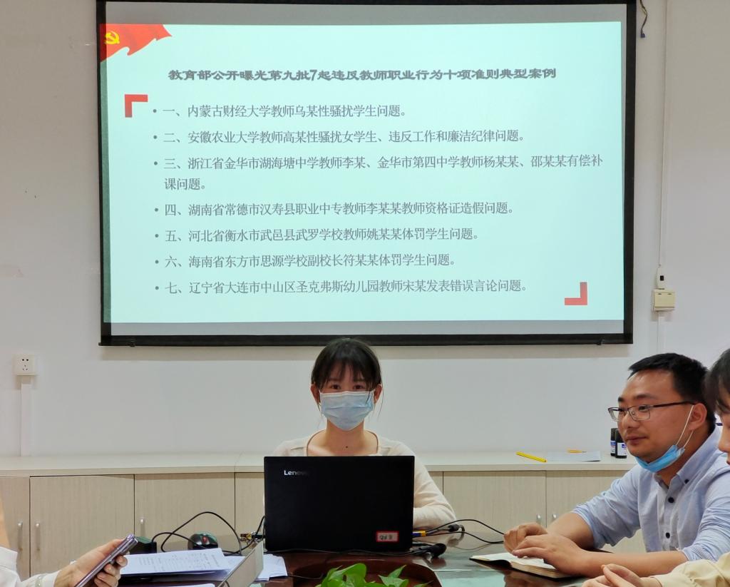 徐舒寧同志分享了《教育部公開曝光第九批7起違反教師職業(yè)行為十項準則典型案例》的心得體會。她強調(diào),作為一名高校思政課教師,必須自覺地加強自身的職業(yè)道德修養(yǎng),既要以學問教人,又要以道德范人。尤其是應不斷加強自身的學術道德修養(yǎng),做到自覺、自醒、自強、自重、自律,從而提高自己樹立良好師德師風的自覺性,以自己高尚的品德塑造廣大青年學生的人格和品質(zhì)。