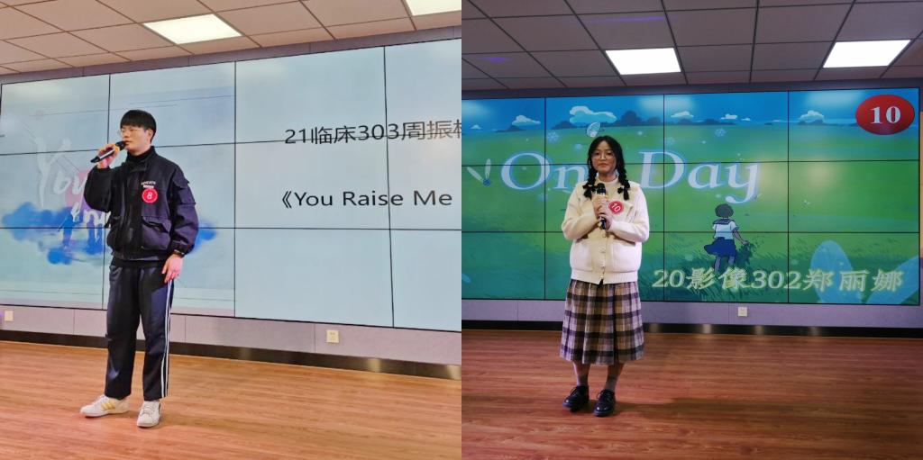 在復(fù)賽環(huán)節(jié),選手們演唱了各自擅長(zhǎng)的曲目,有的曲風(fēng)深沉、動(dòng)人心弦;有的曲調(diào)歡快、引人跟唱。其中,21級(jí)臨床301班周振榕同學(xué)深情演唱的《You raise me up》,唱出了閩衛(wèi)院學(xué)子對(duì)父母、對(duì)祖國(guó)真摯的感恩之情;20級(jí)影像301班的鄭麗娜等同學(xué)激情演唱《One day》,表達(dá)了閩衛(wèi)院學(xué)子對(duì)世界和平的由衷祝愿。