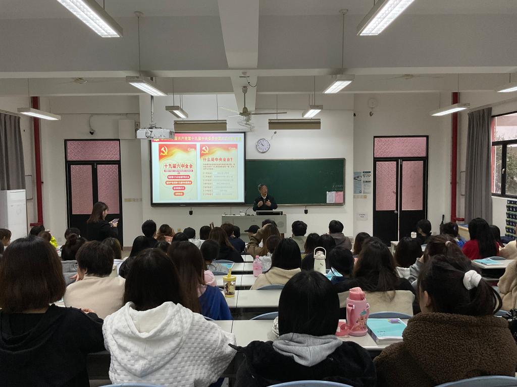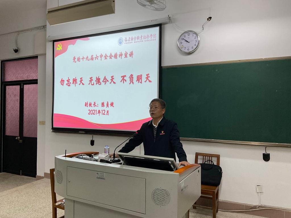為深入學(xué)習(xí)貫徹黨的十九屆六中全會(huì)精神和福建省第十一次黨代會(huì)精神,12月17日上午,副校長(zhǎng)陳貞健在教學(xué)樓110教室為21級(jí)美容專(zhuān)業(yè)105名師生宣講黨的十九屆六中全會(huì)精神。
