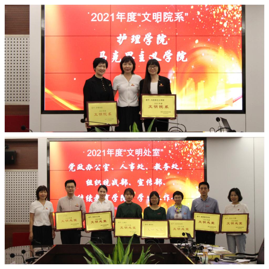 為營造文明建設(shè)的良好氛圍,大會(huì)對獲得2021年度“文明院系”和“文明處室”的單位進(jìn)行了表彰。2021年度,護(hù)理學(xué)院、馬克思主義學(xué)院獲得“文明院系”榮譽(yù)稱號,黨政辦公室、人事處、教務(wù)處、組織統(tǒng)戰(zhàn)部、宣傳部、繼續(xù)教育學(xué)院、學(xué)生工作部獲得“文明處室”榮譽(yù)稱號。李美華為受表彰的文明院系、處室頒發(fā)了獎(jiǎng)牌。