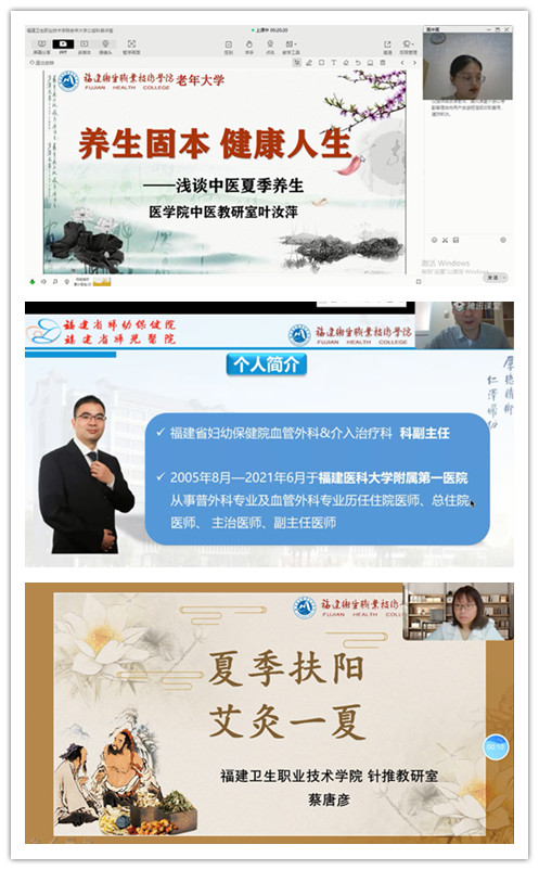 病從淺中醫(yī),預(yù)防最關(guān)鍵。福建省婦幼保健院副主任醫(yī)師詹騰輝及我校醫(yī)學(xué)院葉汝萍、蔡唐彥三位老師分別從《老年人常見血管疾病的防治》《養(yǎng)生固本,健康人生,淺談中醫(yī)夏季養(yǎng)生》《夏季扶陽,艾灸一夏》三個方面,宣傳健康知識,傳播健康理念,倡導(dǎo)健康生活方式,提高健康素養(yǎng)水平。