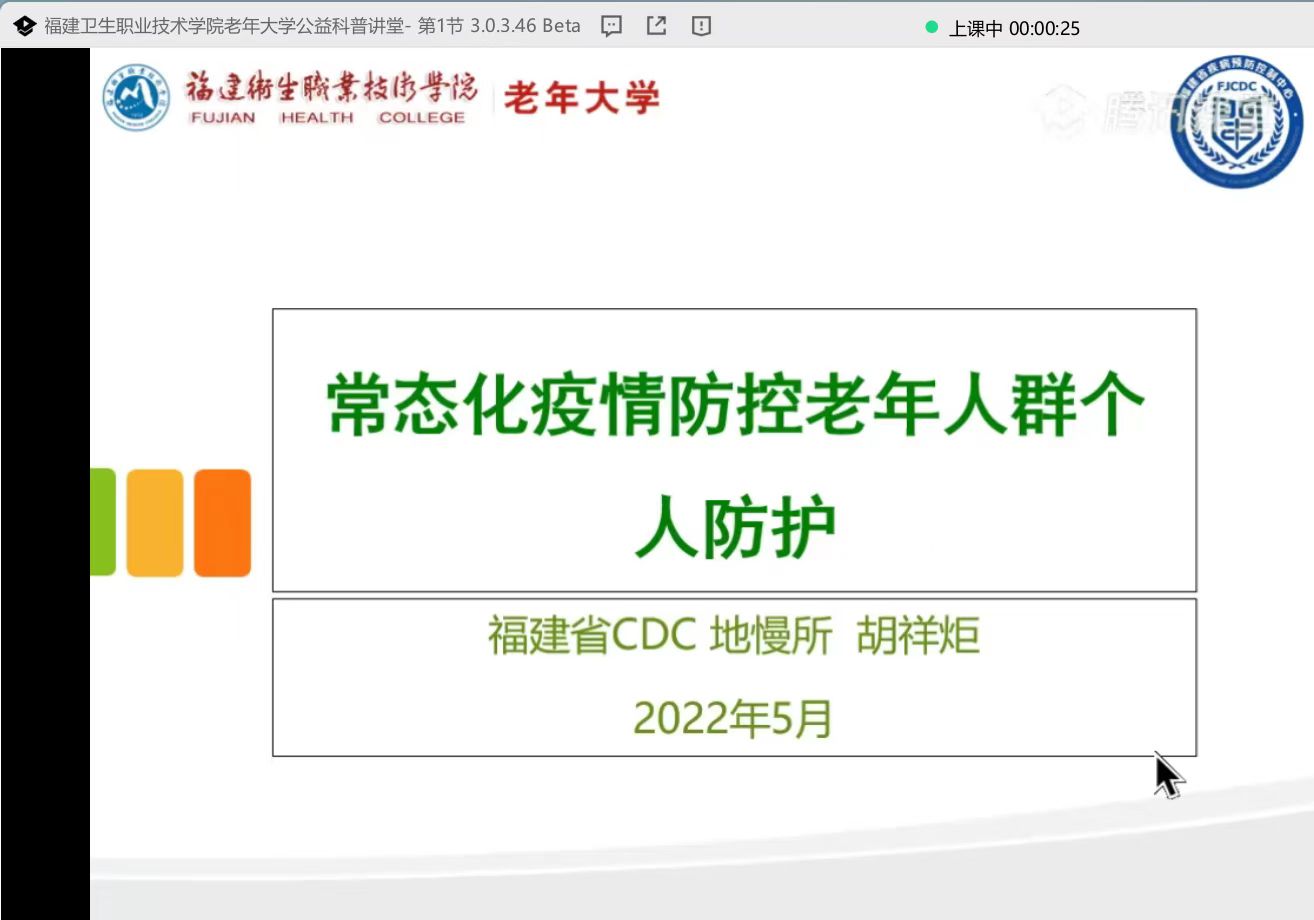 疫情就是命令,防控就是責(zé)任,防控疫情人人有責(zé)。福建省疾病預(yù)防控制中心副主任醫(yī)師胡祥炬以《常態(tài)化疫情防控下老年人群個人防護(hù)》為題,通過自身支援湖北宜昌,省內(nèi)莆田、寧德、廈門等地一線疫情防控的所見所聞所感,呼吁老年人及時全程接種疫苗,指導(dǎo)老年人如何做好家庭消毒等科學(xué)有效的預(yù)防措施,確保老年人的身心健康。