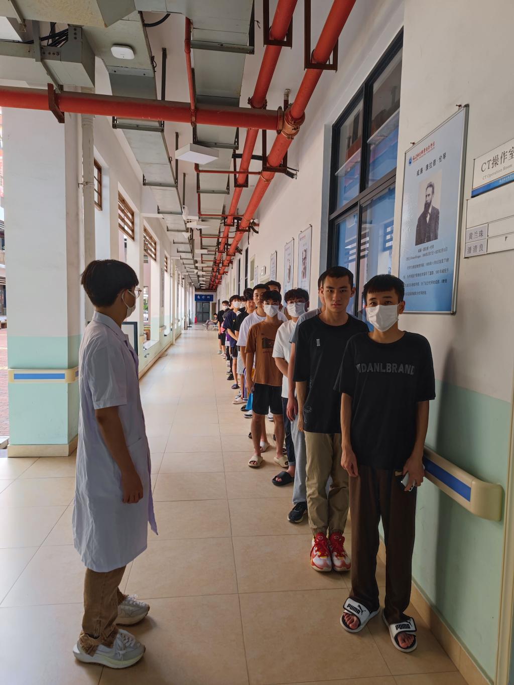 2022年9月9日至18日,在門診部DR室門口,學(xué)生每隔1米整齊列隊,有序等候,他們正在參加我校聯(lián)影醫(yī)學(xué)影像產(chǎn)業(yè)學(xué)院聯(lián)合門診部組織的新生入學(xué)胸片體檢。