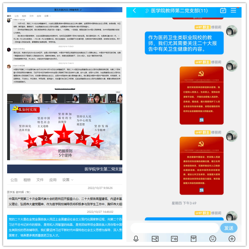 醫(yī)學(xué)院黨總支通過(guò)全院教職工大會(huì)、黨總支理論學(xué)習(xí)中心組(擴(kuò)大)會(huì)議、主題黨日、主題班會(huì)、團(tuán)日活動(dòng)等形式,全面系統(tǒng)地將黨的二十大報(bào)告的思想精髓及核心要義,傳達(dá)到每一位師生員工。同時(shí),還圍繞學(xué)習(xí)貫徹黨的二十大精神,展開(kāi)主題研討和心得交流活動(dòng),以思想碰撞夯實(shí)理想信念之基,推進(jìn)學(xué)習(xí)走心、走實(shí)、走深。