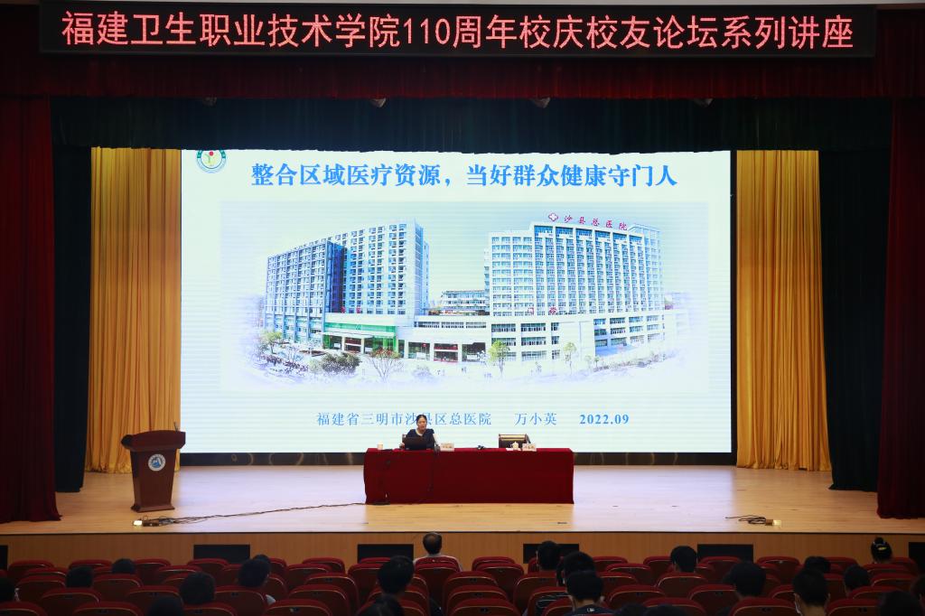 為迎接110周年校慶,9月22日下午,我校舉行校慶系列活動(dòng)之校友論壇首場(chǎng)講座。學(xué)校邀請(qǐng)優(yōu)秀校友、三明市沙縣區(qū)人大常委會(huì)副主任、沙縣區(qū)總醫(yī)院黨委書記萬(wàn)小英作題為《我們的事業(yè)就是總書記說的那個(gè)1》專題講座。各院系師生代表參加,講座由校長(zhǎng)許能鋒主持。