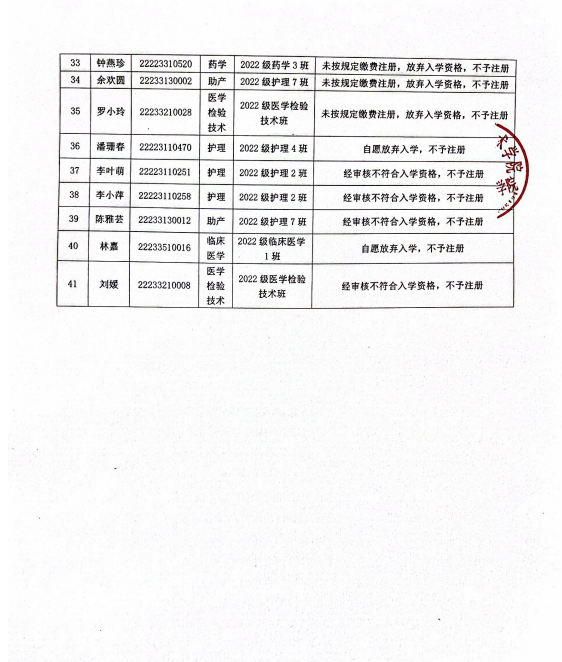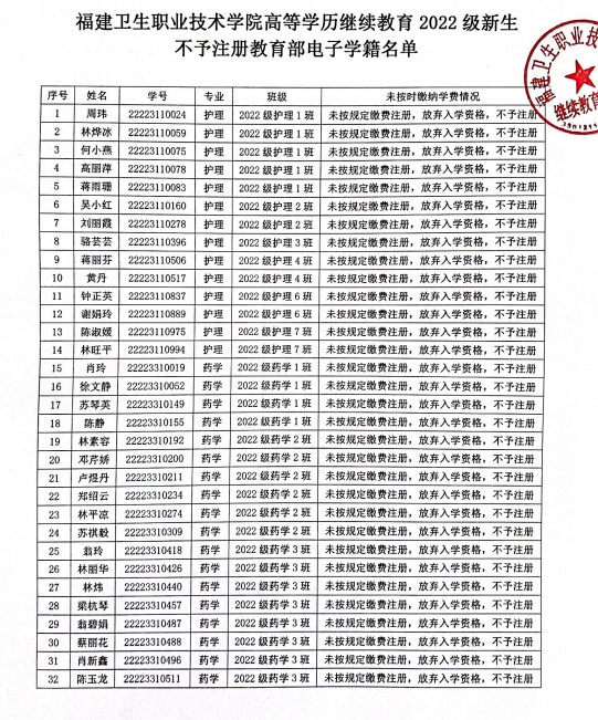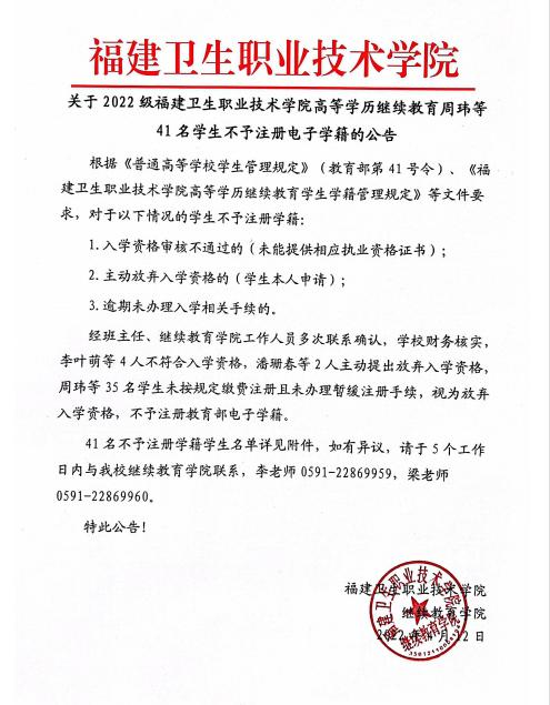 關(guān)于2022級福建衛(wèi)生職業(yè)技術(shù)學(xué)院高等學(xué)歷繼續(xù)教育周瑋等41名學(xué)生不予注冊電子學(xué)籍的公告