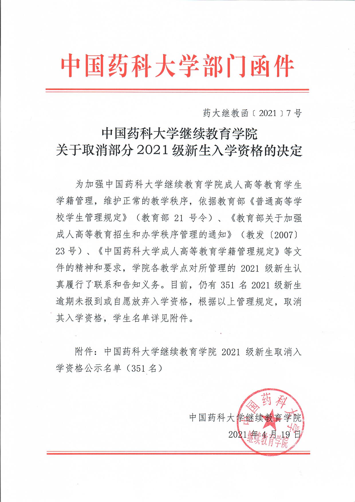 中國(guó)藥科大學(xué)繼續(xù)教育學(xué)院關(guān)于取消部分2021級(jí)新生入學(xué)資格的決定