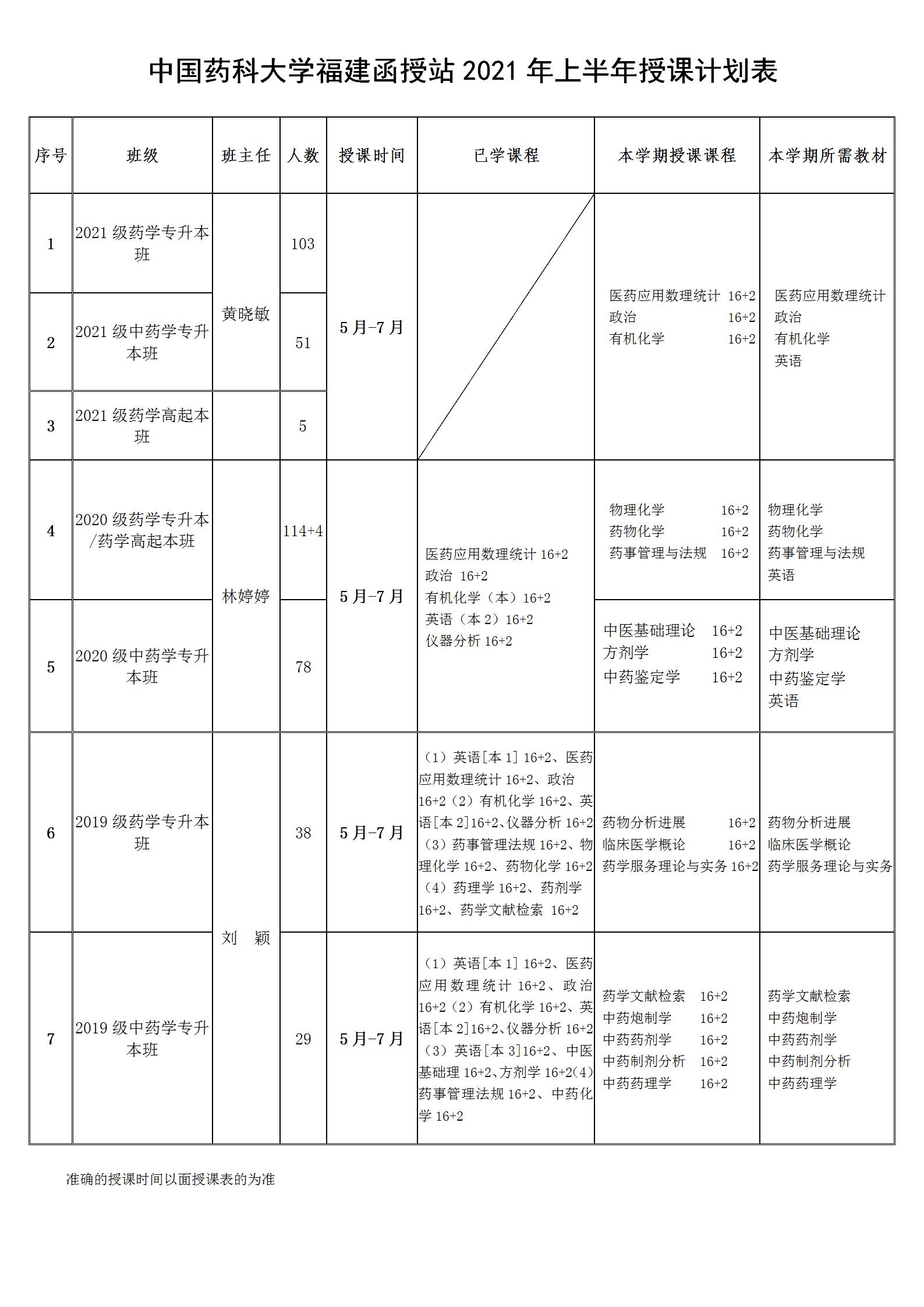 中國藥科大學(xué)福建函授站2021年上半年面授計劃表