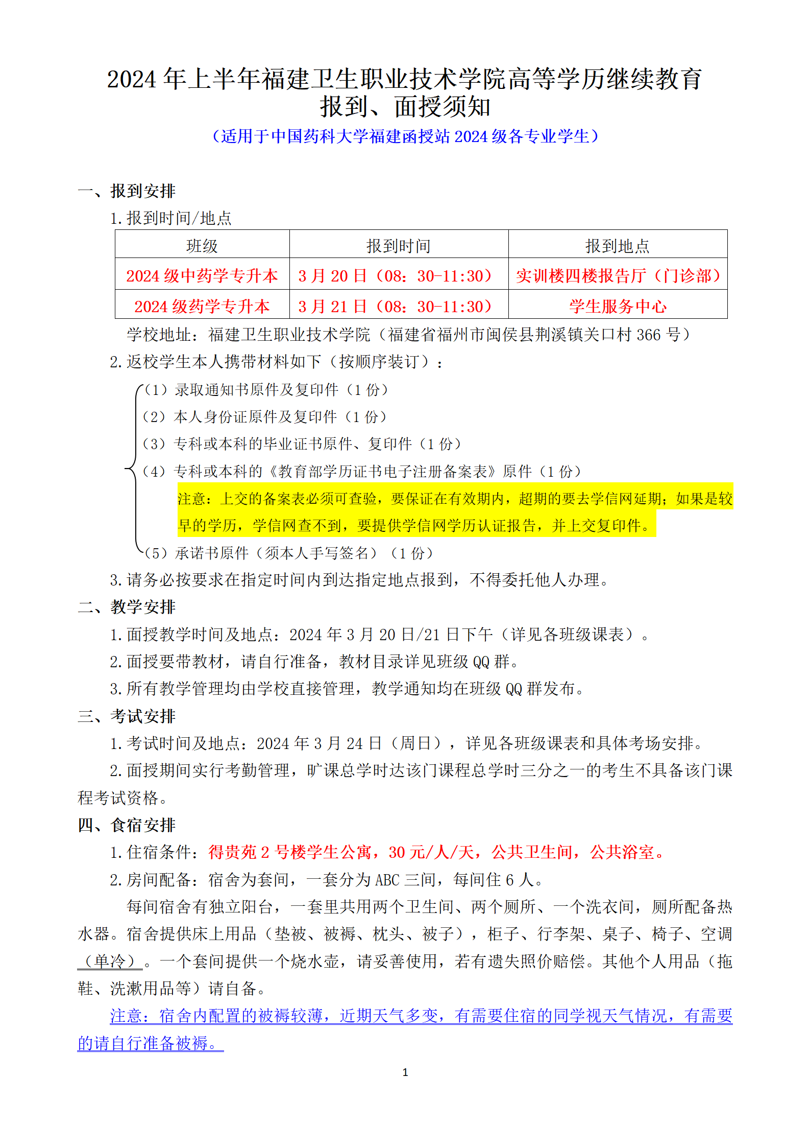 福建衛(wèi)生職業(yè)技術(shù)學院高等學歷繼續(xù)教育返校面授須知(適用于中國藥科大學福建函授站2024級各專業(yè)學生)