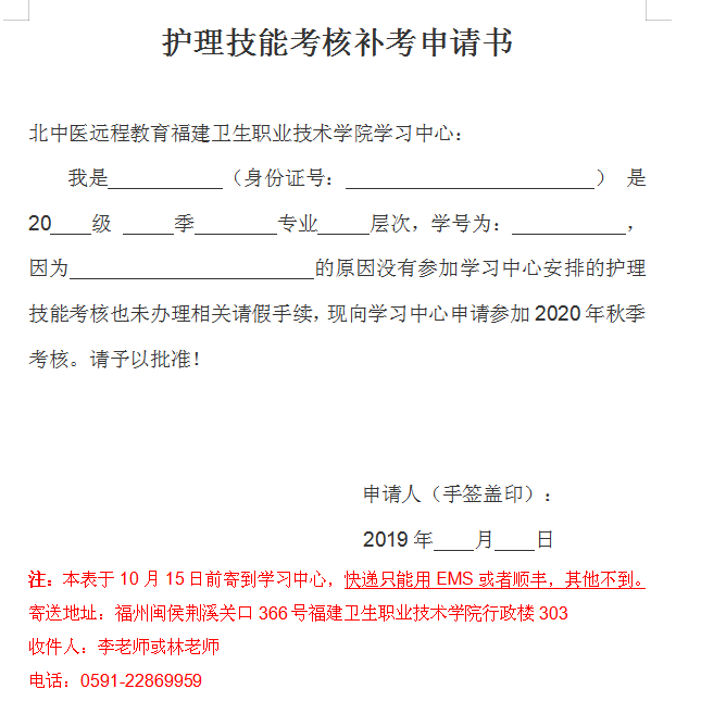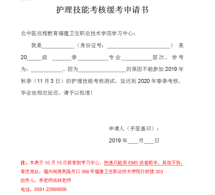3.請(qǐng)各位學(xué)生做好調(diào)班請(qǐng)假手續(xù)(緩考申請(qǐng)?jiān)斠?jiàn)附件3)。若有特殊情況(如懷孕、坐月子、生病等)不能參加護(hù)理技能測(cè)試的,請(qǐng)于10月15日前向?qū)W習(xí)中心提交書(shū)面緩考申請(qǐng)延遲到2020年春季測(cè)試,畢業(yè)時(shí)間相應(yīng)延遲。為有效利用考試資源,之前無(wú)故缺考的考生需提前提交補(bǔ)考申請(qǐng)方可參加本次考核(補(bǔ)考申請(qǐng)?jiān)斠?jiàn)附件4)。