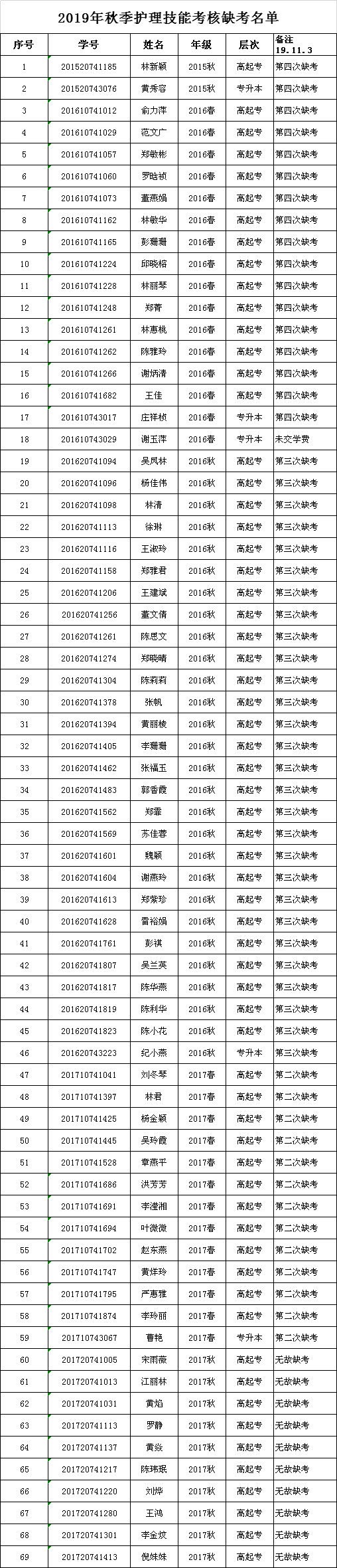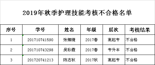北京中醫(yī)藥大學(xué)遠(yuǎn)程教育福建衛(wèi)生職業(yè)技術(shù)學(xué)院學(xué)習(xí)中心2019年秋季護(hù)理技能考核工作已于11月3日完成,現(xiàn)將考核不合格名單公示如下,請不合格同學(xué)及時(shí)關(guān)注學(xué)習(xí)中心網(wǎng)站(福建衛(wèi)生職業(yè)技術(shù)學(xué)院官網(wǎng)http://www.fjwzy.cn/jjzx/ycjy/bjzyydxycjyfjwszyjsxyxxzx/jxtz.htm)或者微信公眾號的通知,并于明年春季參加補(bǔ)考。