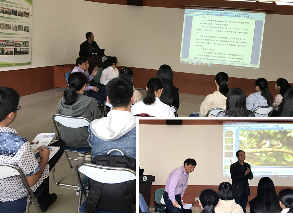 王屏老師對(duì)鳥(niǎo)類攝影情有獨(dú)鐘,通過(guò)多年的創(chuàng)作積累,拍攝到了許多珍貴相片,不但具有一定的藝術(shù)性,而且很有科普價(jià)值。值得一提的是,其中很多相片攝于我們校園,體現(xiàn)了我院清新自然的生態(tài)美?;顒?dòng)中他向大家科普了鳥(niǎo)類相關(guān)知識(shí),并生動(dòng)地描述了自己多年的拍鳥(niǎo)經(jīng)歷,現(xiàn)場(chǎng)有問(wèn)有答,氣氛活躍。之后,還帶領(lǐng)大家到圖書館一樓攝影展前細(xì)致的講解了他拍攝的作品,大家進(jìn)行了更加深入的交流討論。通過(guò)這次活動(dòng)增強(qiáng)了我們與大自然和諧共生的意識(shí),積極響應(yīng)了十九大報(bào)告提出的生態(tài)文明建設(shè)號(hào)召。