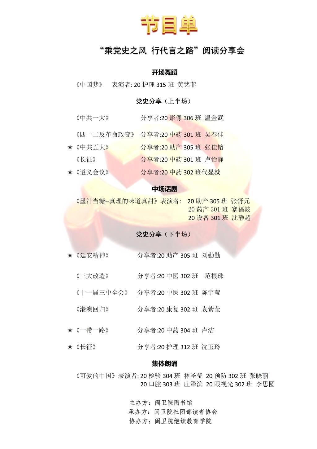 11位學(xué)生通過(guò)閱讀“中共一大”、“四一二反革命政變”、“中共五大”、“紅軍長(zhǎng)征”、“遵義會(huì)議”、“延安精神”、“社會(huì)主義三大改造”、十一屆三中全會(huì)、“ 港澳回 歸”、“一帶一路”等黨史事件的相關(guān)書(shū)籍,分享自己的閱讀感悟。