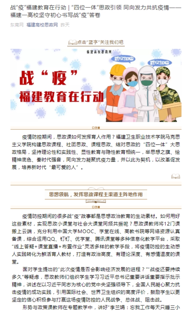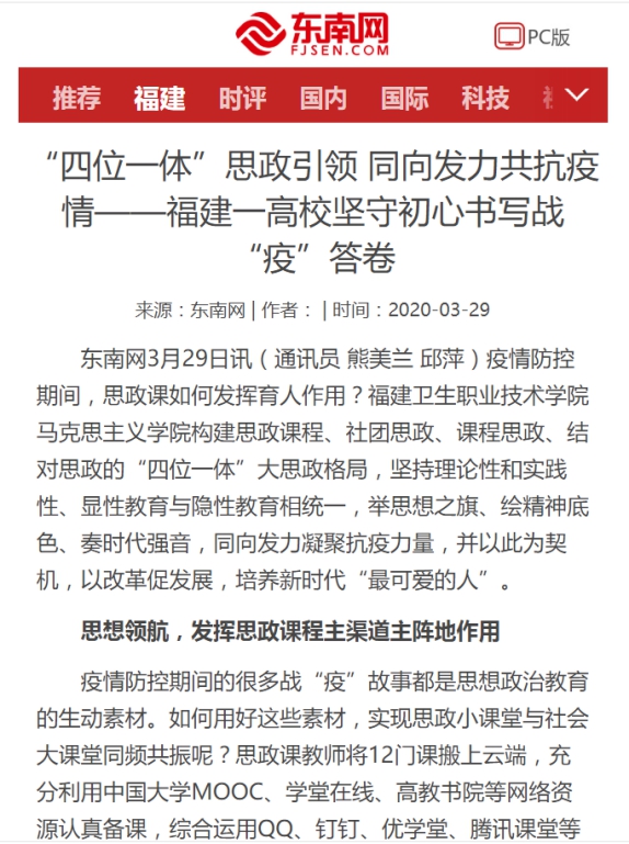 《東南網(wǎng)》3月29日以《四位一體”思政引領(lǐng) 同向發(fā)力共抗疫情——福建一高校堅守初心書寫戰(zhàn)“疫”答卷》對馬克思主義學院進行了報道。