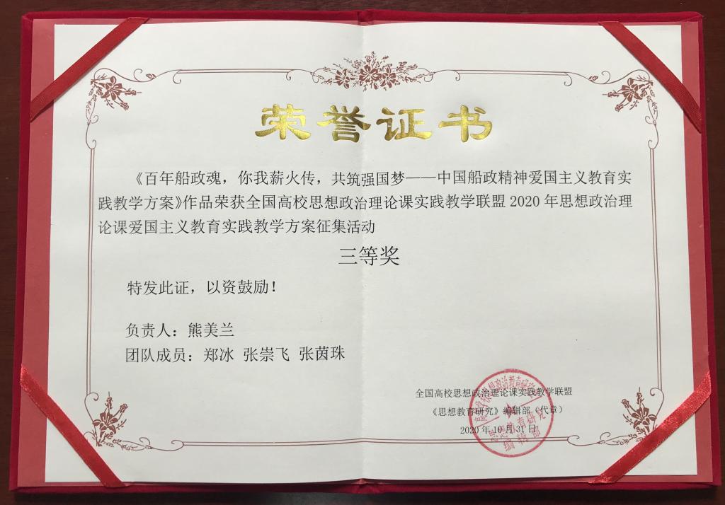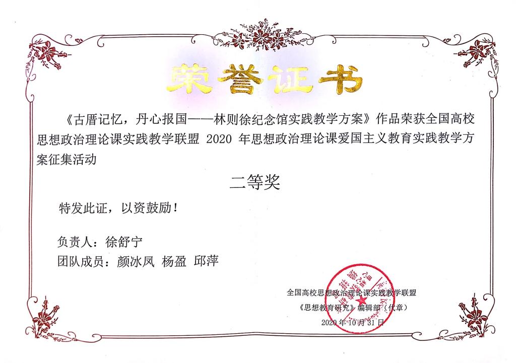 本次征集活動(dòng)中,全國(guó)59所高校報(bào)送的作品91件愛(ài)國(guó)主義教育實(shí)踐方案作品中,共評(píng)選出一等獎(jiǎng)5項(xiàng),二等獎(jiǎng)15項(xiàng), 三等獎(jiǎng)20項(xiàng)。我院積極申報(bào)作品,其中徐舒寧老師團(tuán)隊(duì)的作品《古厝記憶,丹心報(bào)國(guó)——林則徐紀(jì)念館實(shí)踐教學(xué)方案》獲得二等獎(jiǎng),熊美蘭老師團(tuán)隊(duì)作品《百年船政魂,你我薪火傳,共筑強(qiáng)國(guó)夢(mèng) ——中國(guó)船政精神 愛(ài)國(guó)主義教育實(shí)踐教學(xué)方案》獲得三等獎(jiǎng)。