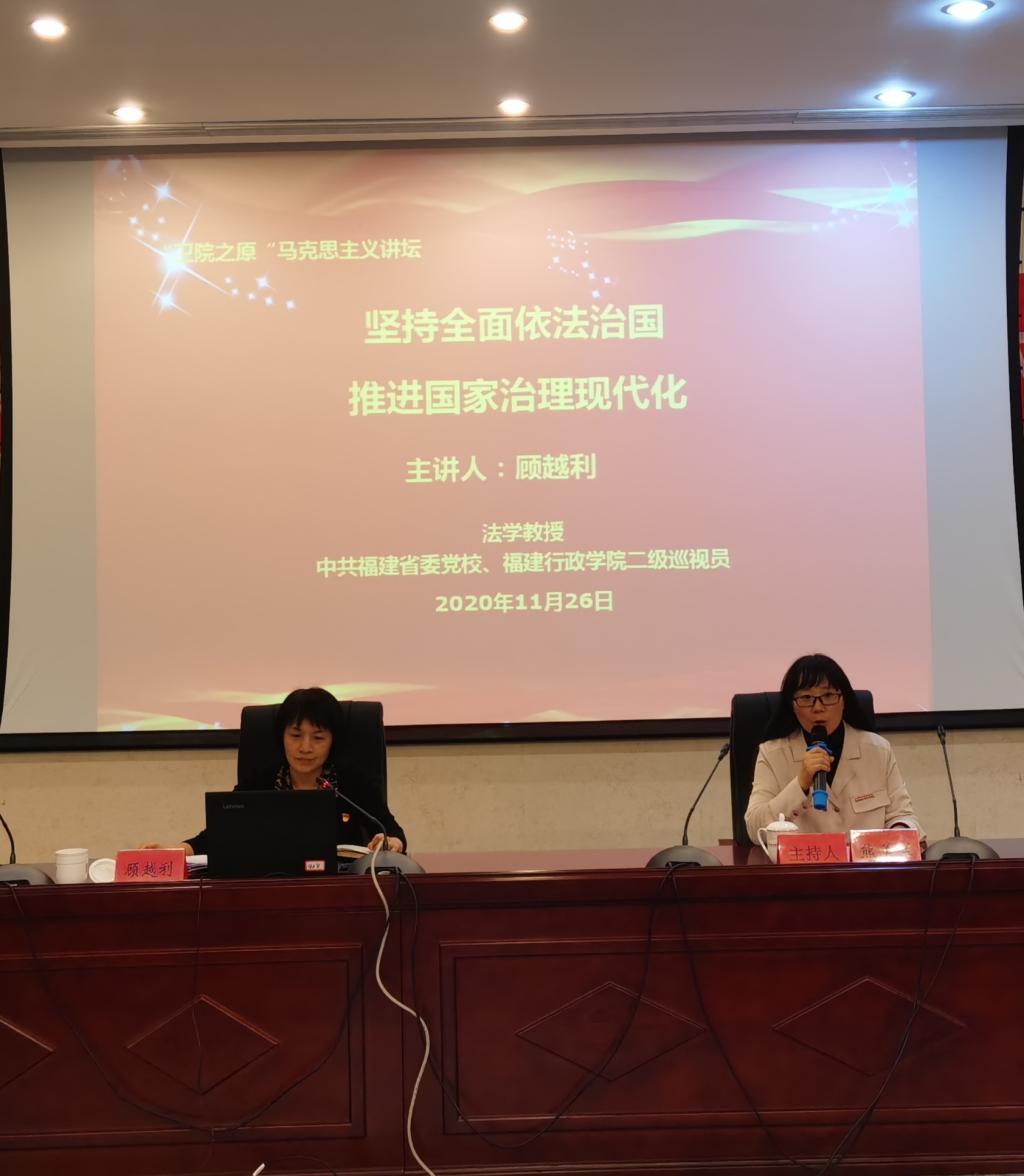 法治興則國(guó)興,法治強(qiáng)則國(guó)強(qiáng)。全面依法治國(guó)是一項(xiàng)長(zhǎng)期而重大的歷史任務(wù),也是國(guó)家治理領(lǐng)域一場(chǎng)廣泛而深刻的革命。為深刻理解黨的十九屆五中全會(huì)審議通過(guò)的《中共中央關(guān)于制定國(guó)民經(jīng)濟(jì)和社會(huì)發(fā)展第十四個(gè)五年規(guī)劃和2035年遠(yuǎn)景目標(biāo)的建議》中提出的“國(guó)家治理效能得到新提升”、“社會(huì)主義民主法治更加健全”和到2035年“基本建成法治國(guó)家、法治政府、法治社會(huì)”的目標(biāo)任務(wù);同時(shí)提升廣大師生對(duì)“全面依法治國(guó)”在“四個(gè)全面”戰(zhàn)略布局中基礎(chǔ)性作用的理解,筑牢法治意識(shí),不斷提高法治思維,2020年11月26日下午,學(xué)校特邀中共福建省委黨校顧越利教授作《堅(jiān)持全面依法治國(guó)推進(jìn)國(guó)家治理現(xiàn)代化》專題講座。馬院全體專兼職教師以及青馬班學(xué)員參加了此次講座。