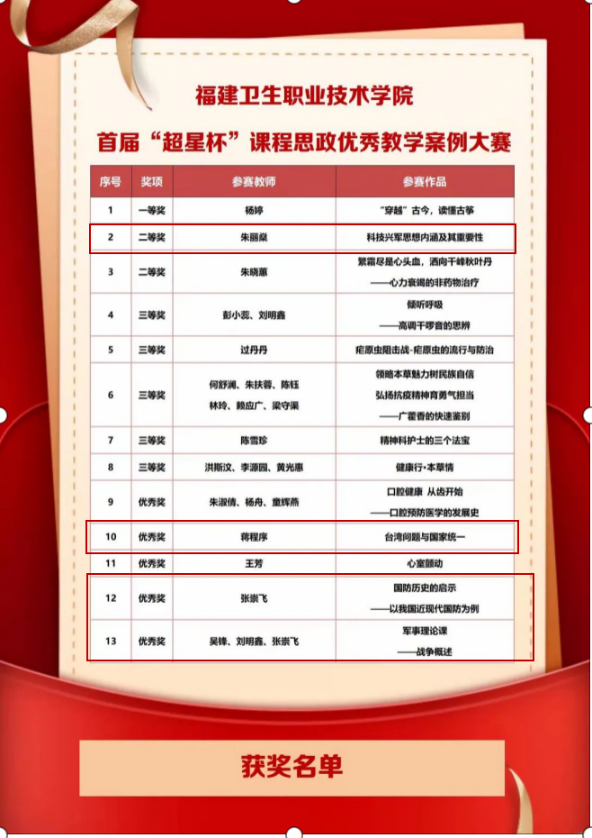 據(jù)悉,本次大賽共收到143所職業(yè)院校600多個(gè)教學(xué)團(tuán)隊(duì)的作品,馬克思主義學(xué)院參賽教師經(jīng)過(guò)反復(fù)研討、認(rèn)真打磨、試講演練等,最終喜獲佳績(jī)。