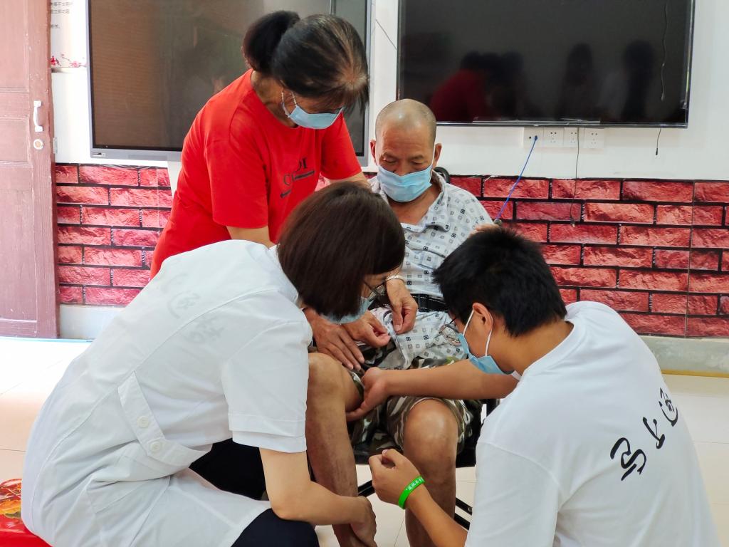 活動現(xiàn)場,實踐隊師生以其專業(yè)贏得村民好贊連連?!拔覑廴税c瘓臥床,他要是能來現(xiàn)場就好了!”村民江本松的妻子感慨。實踐隊了解情況后,從家里接來了江本松老人。在詳細了解病情之后,徐麗鶯和屈立為其進行肢體的被動活動和四肢牽伸,并細致提供康復(fù)保健建議,獲得老人連聲道謝。