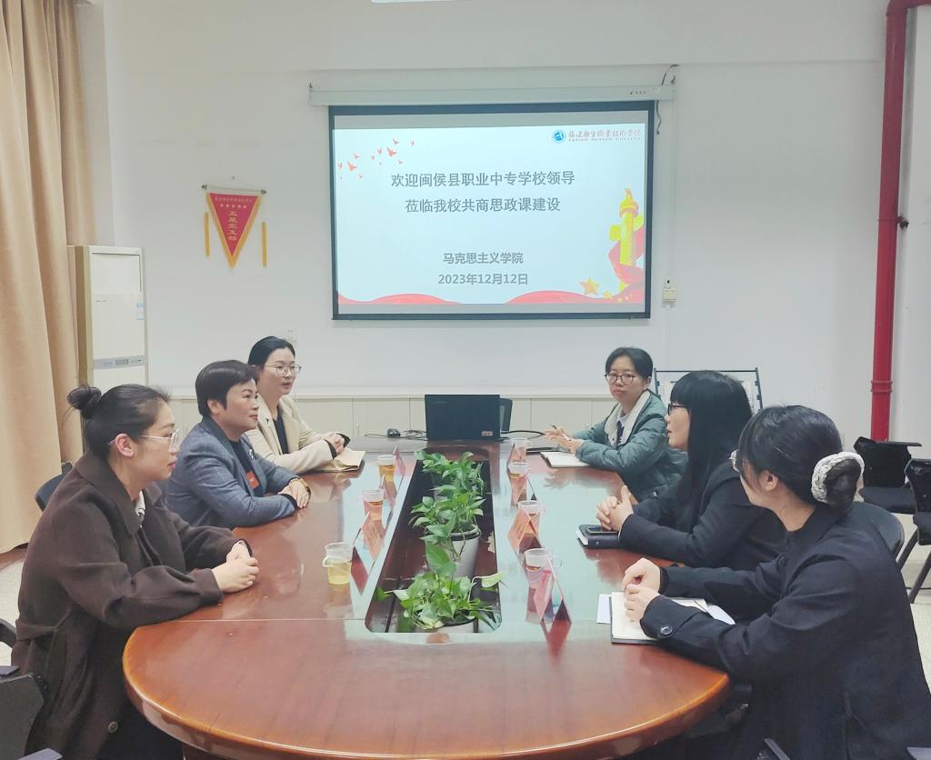 為深入貫徹習(xí)近平總書記關(guān)于思政課建設(shè)的重要論述和“大思政課”的重要指示,2023年12月12日,閩侯縣職業(yè)中專學(xué)校副校長林曉彬、職教處主任蔡珊、德育組組長吳秀倩一行3人蒞臨我校馬克思主義學(xué)院共商“大中小學(xué)思政課一體化建設(shè)”事宜。馬克思主義學(xué)院院長熊美蘭、副書記賴文金熱情接待,并在行政樓107會(huì)議室開展交流座談。